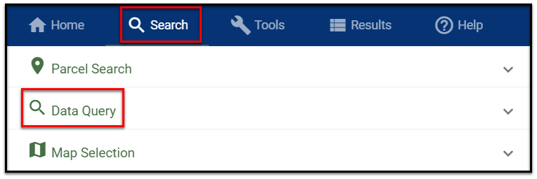 The Data Query function allows the user to select features based on attribute table values. Access this tool by clicking on the Search tab on the Contents panel and then clicking on Data Query: