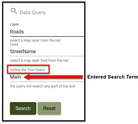 If a text field was chosen, Define the Text Query will display. Enter the text on which to search and click the Search button. The query will perform a substring search and the results will be displayed.