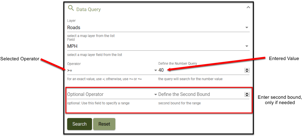 Use these to create the query. Select an operator (less than, greater than, or equals) and then enter the number. If 'less than' or 'greater than' was selected, define the second bound if needed. Click the Search button. Results matching the entered query will display.