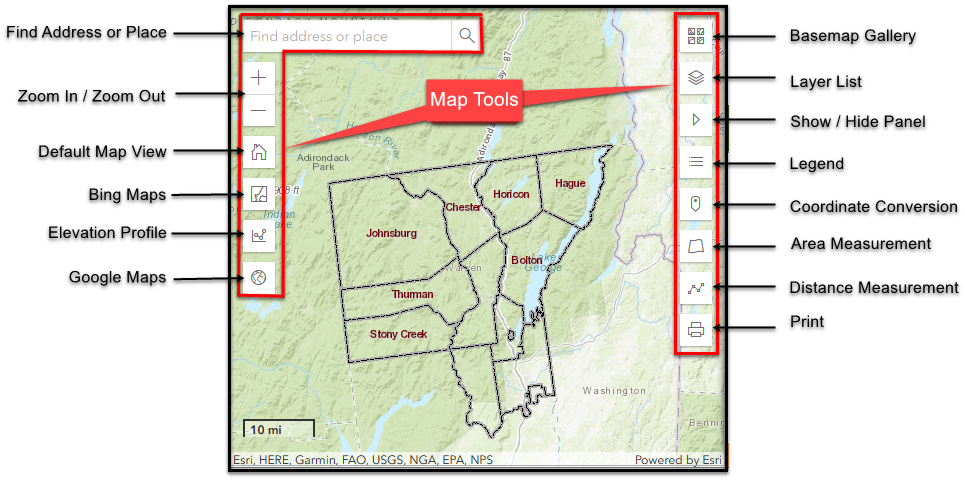 There are many tools located within the map window that control how the map looks and behaves. Refer to the individual topics, for additional information: