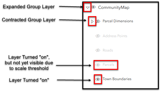 Expand/Contract a group layer: Click the arrow button to the left of the group layer name. The arrow will now point to the bottom of the screen. Click the down arrow to contract the group layer. The arrow will now point to the group layer name.