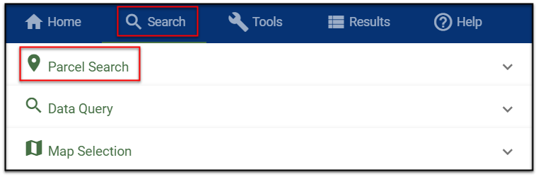 Click the Search option on the Content Panel to display the different search options. Click Parcel Search.