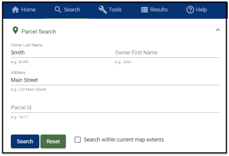 Enter the search options by filling in as much of the information as possible. In the example below, Last Name and Street Name are supplied. Click Search when ready to find results. Optionally enable the Search within the current map extent to restrict the search results to parcels currently shown on the map.