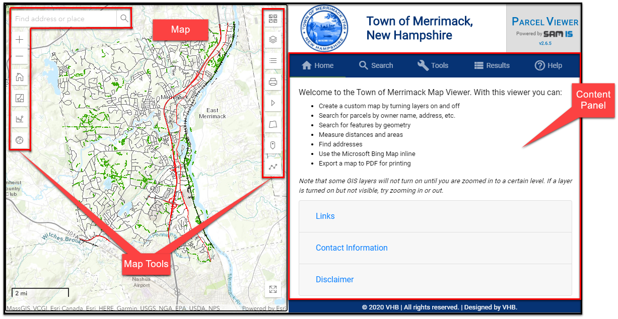 The Town of Merrimack, New Hm Parcel Viewer is an Internet-based Geographic Information System (GIS). A GIS combines geographic data about a community, including tax parcels, water features, and aerial photographs, with tools to visualize, query, and map these features. Map Tools and Functions can be accessed through buttons and panels located in the map display window. These tools and functions provide the ability to move around the map, change layer display settings, identify features, and perform searches for features within individual layers. Options also include the ability to draw text and graphics on the map, export records, and print a map. The following Help documentation will provide detailed instructions on the use of various tools and functions of this on-line GIS application. See below for a labeled screen shot of the application.