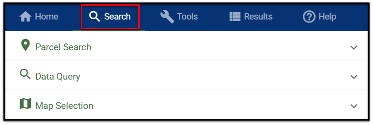 The Search tab contains specialized tools to query map data, including Parcel Search, Data Query and Map Selection. The Parcel Search function provides the ability to find parcels based on specified criteria, while the Data Query tool searches a layer to find records via attribute values. The Map Selection tool selects features based on their geography rather than attributes. Refer to respective help topics for details on each tool.