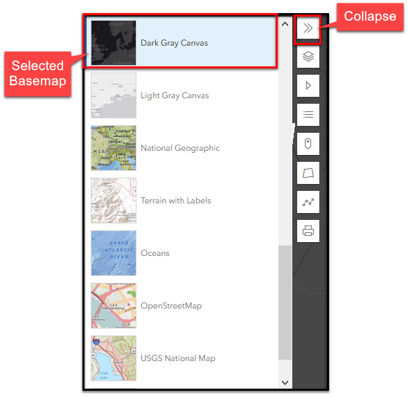 In the image below, the Dark Gray Canvas has been selected. To close the Basemap Gallery, click on the collapse button