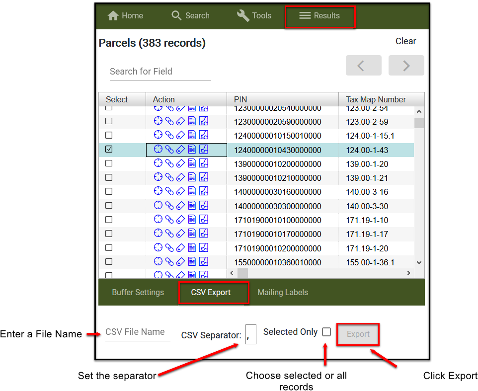 To export the selected set of records from the Results tab, click the CSV Export tab at the bottom of the panel.