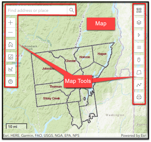 The map pane is comprised of the map, a visual representation of GIS data layers, along with a set of tools to control how the map looks and behaves. For information on using these tools, refer to The Map Tools section of this help system. Click here for an overview on Map Navigation.